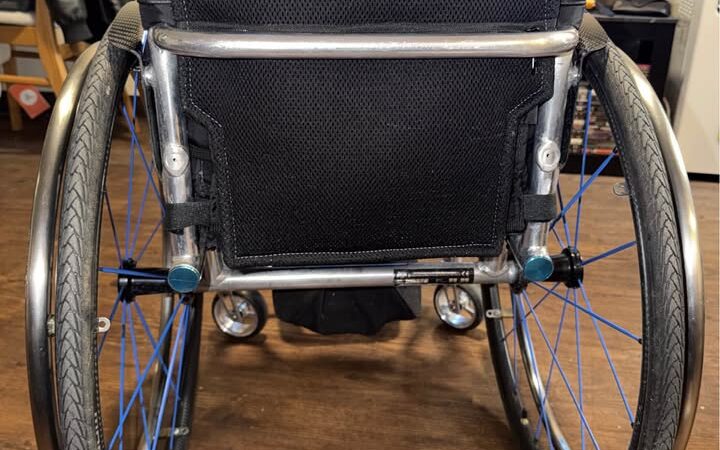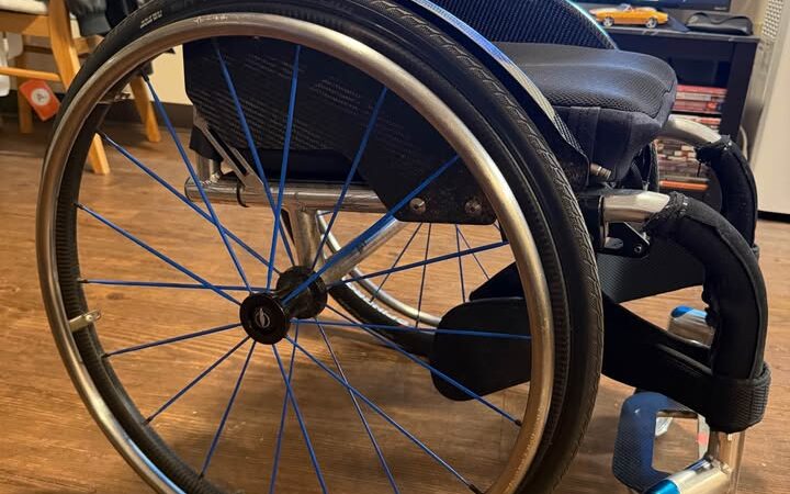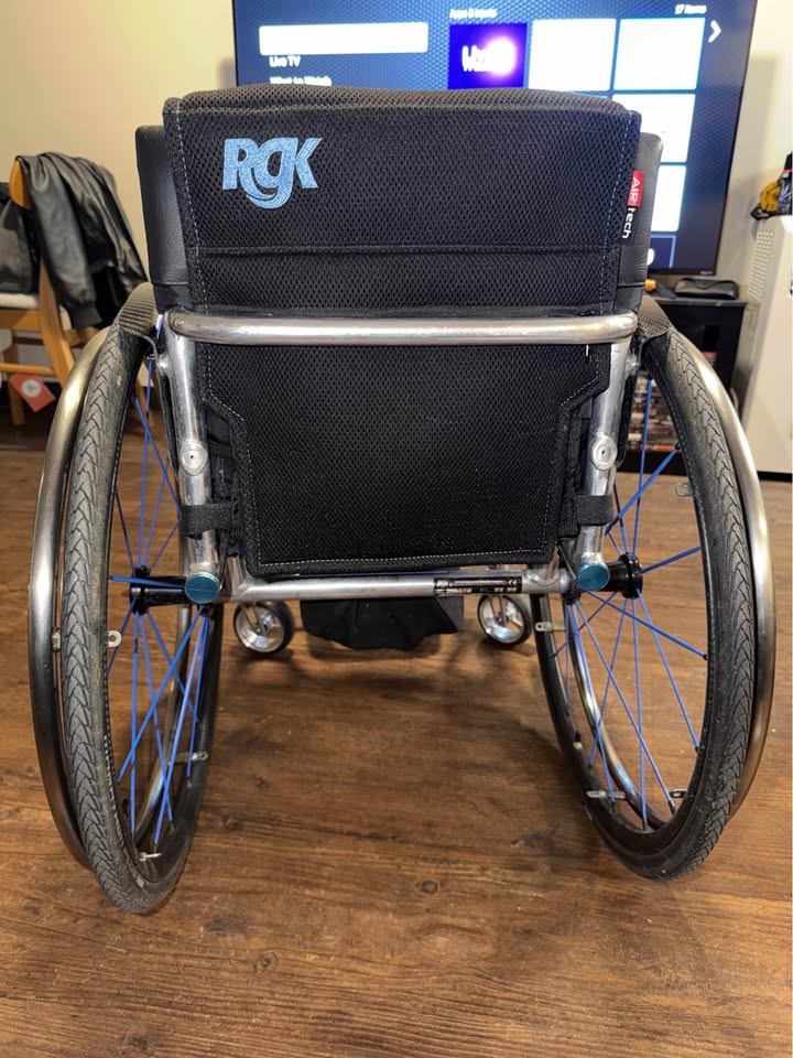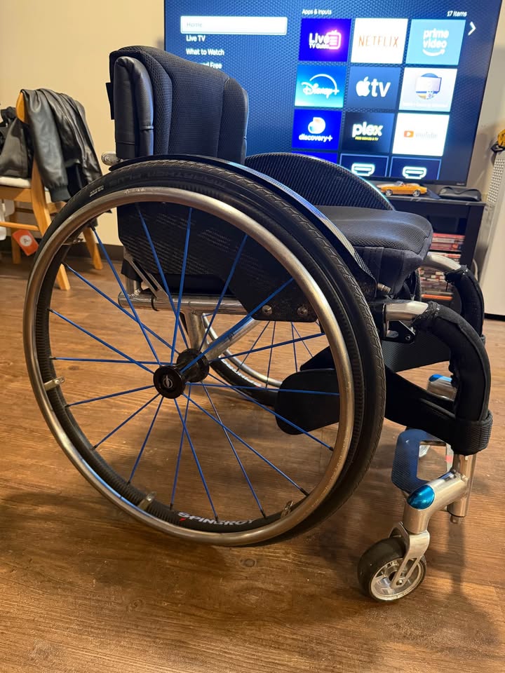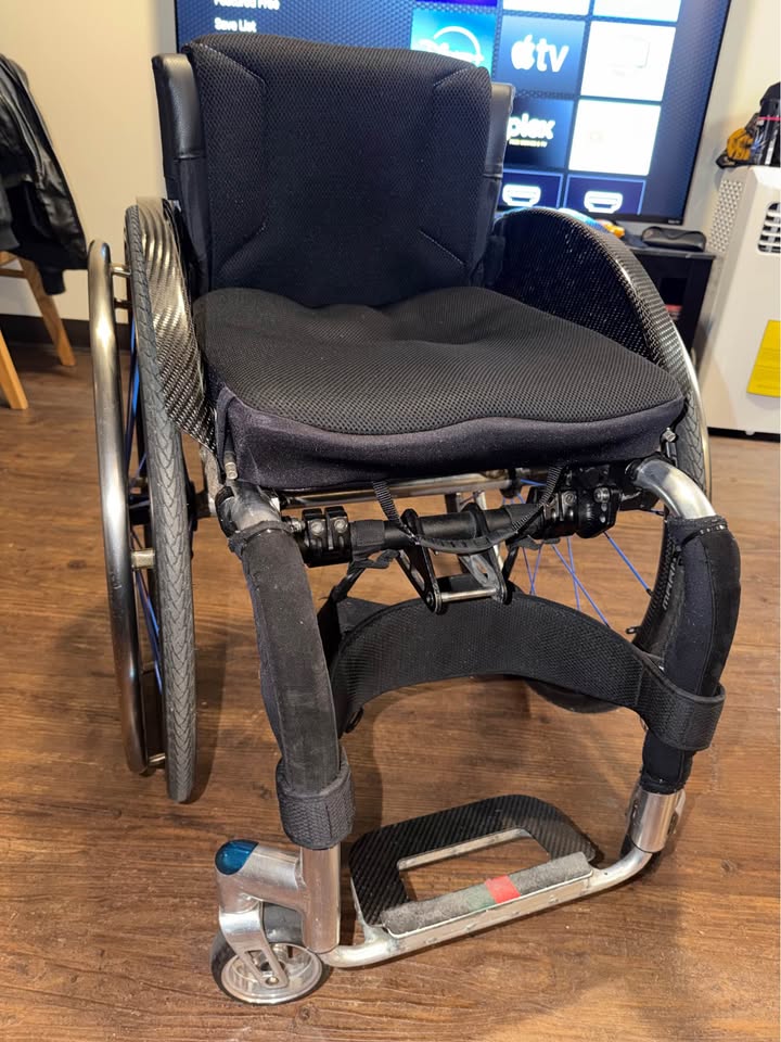 Up for grabs as my new chair is on order! 15” x 15” Ultra-Lightweight Aluminum RGK Sub4 this chair is extremely lightweight (4kg). Has a fixed frame with carbon fendered side guards, 4” frog leg casters, Brand New 25” (559) Blue Spoke Spinergy Carbon Blades w/ Titanium handrims (worth over $2500 alone). Will include Batec mount if needed. Will sell the chair cheaper without the spinergies. Text me for more info!