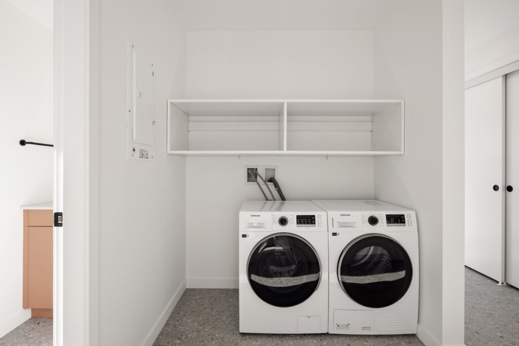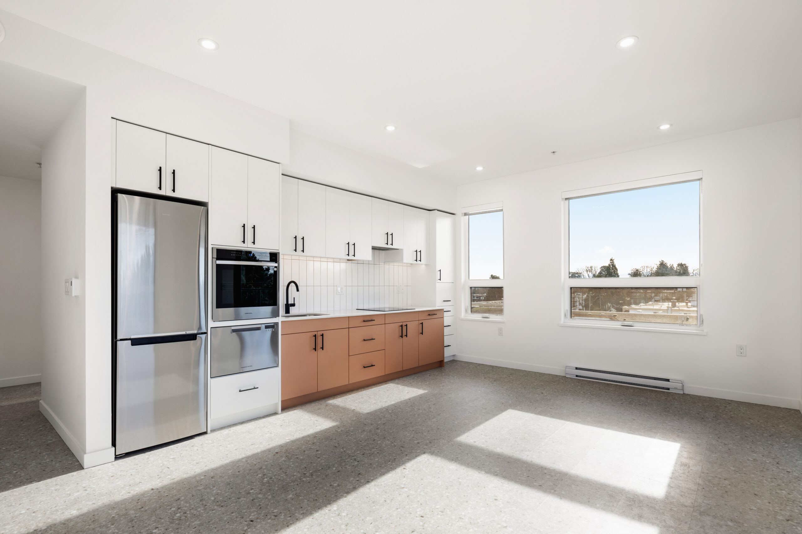 The home is located in a pet-free, smoke-free building with 9-foot overheight ceilings and large windows with custom coverings. Inside, you’ll find in-suite laundry with Smart Care functionality, custom white and ‘Desert Rose’ cabinetry with soft-close drawers, and matte-finish quartz countertops with ample prep space.