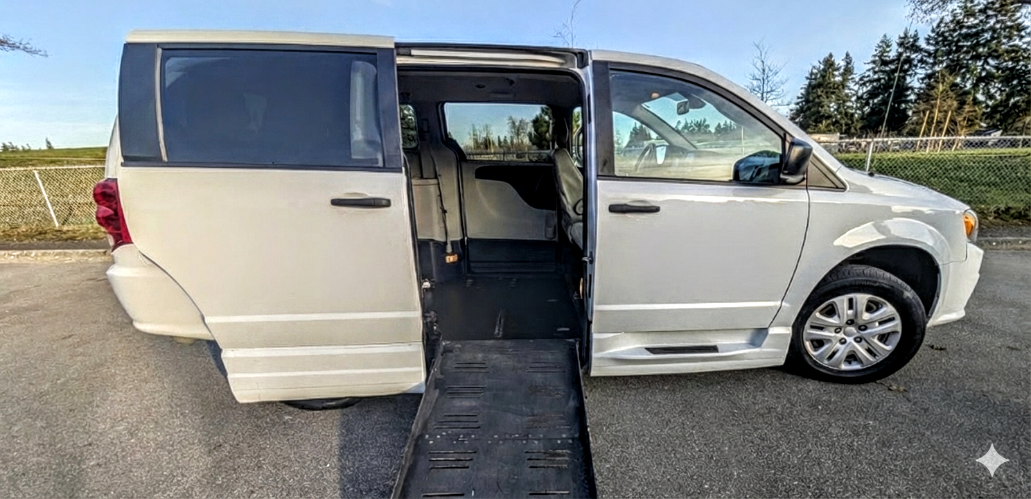 2019 Dodge Grand Caravan, modified with a side-entry manual ramp by Braun Ability. Good condition, with brand new front and rear brakes and all-season tires. Comes with four Q'Straint tie-downs to secure the wheelchair passenger.