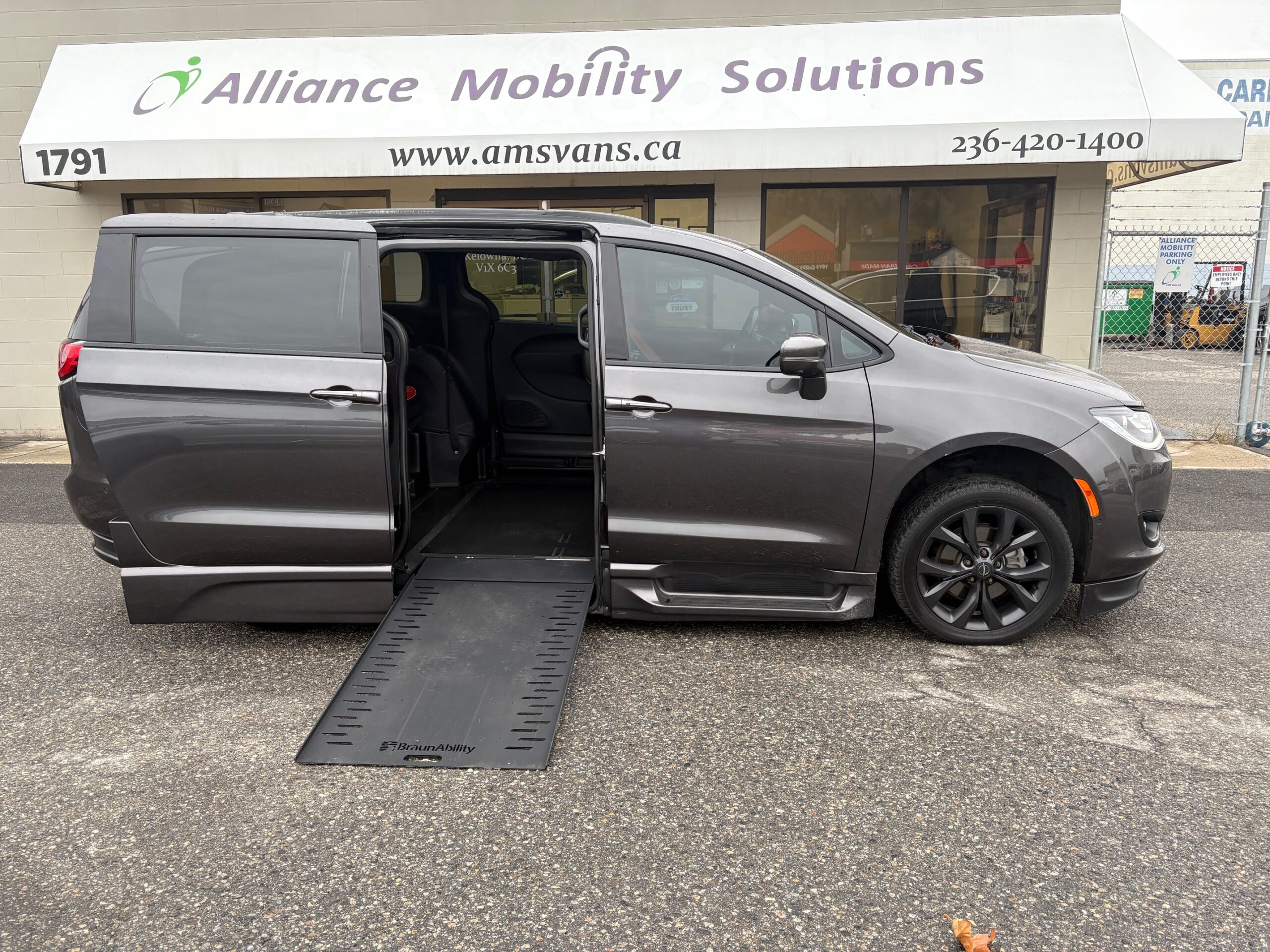This 2020 Chrysler Pacifica Limited is equipped with a power in-floor side entry ramp, offering a sleek, low-profile accessible solution without compromising the look and feel of a premium vehicle. Finished in a clean dark grey exterior, this van combines luxury, functionality, and independence in one package.