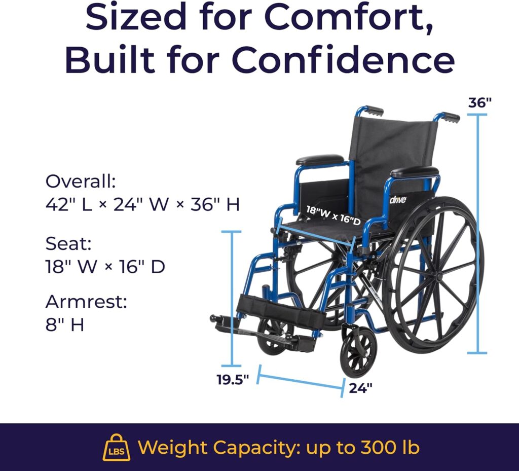 Drive Medical Single Axle Blue Streak Wheelchair, Flip Back Desk Arm, Swing Away Footrests, 18"