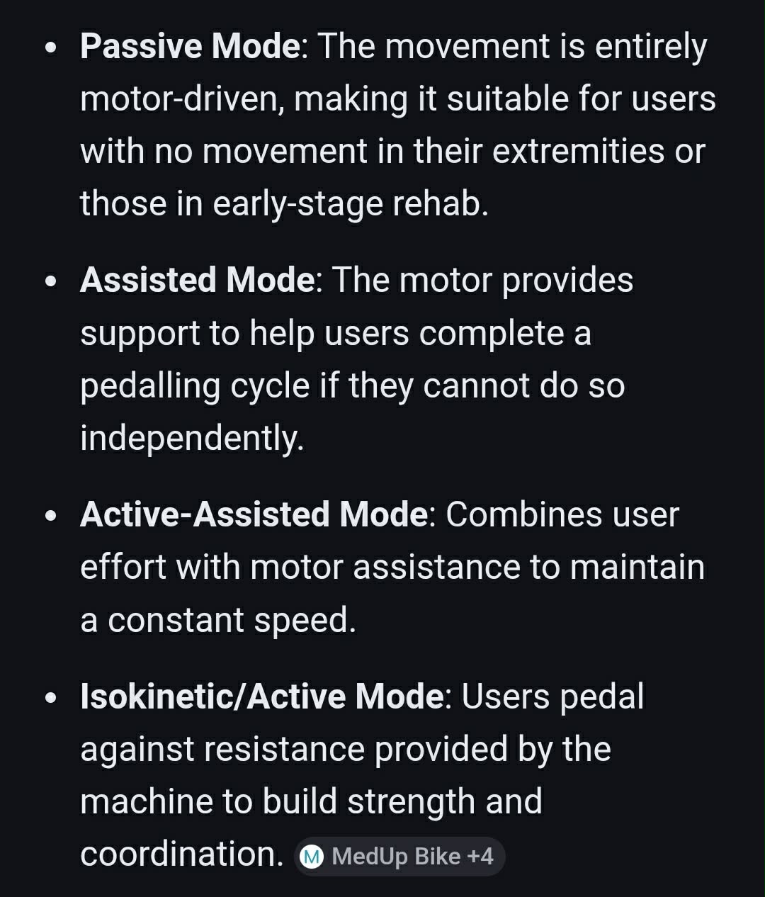 The MedUp V2 is an intelligent, motorized active-passive therapy ergometer designed for the rehabilitation of both upper and lower extremities. It is primarily used to assist individuals with mobility issues due to accidents, strokes, spinal cord injuries, or chronic neurological conditions like Parkinson's and Multiple Sclerosis.