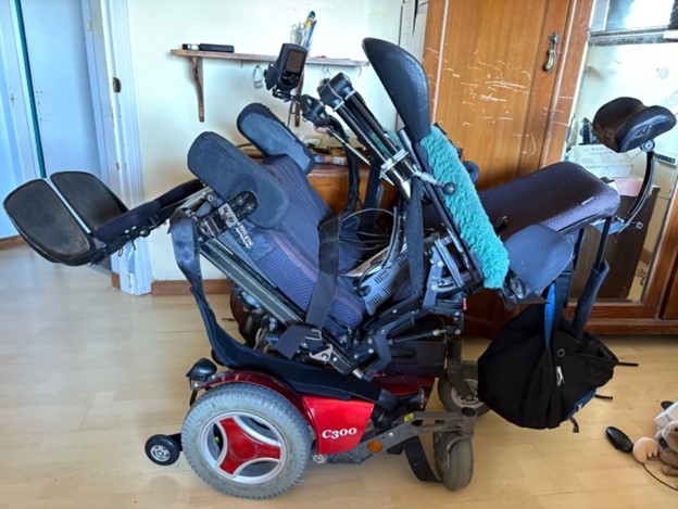 This wheelchair is set up for use by a quadriplegic. The controller is a custom chin control. Used lightly mostly indoors.