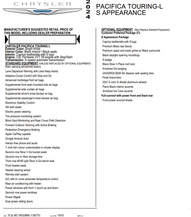 Preowned 2024 Chrysler Pacifica Touring-L (S appearance) with New Sidewinder Chrysler RAV Rear Entry Conversion