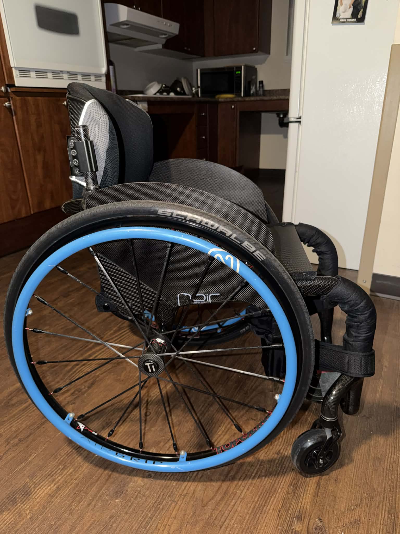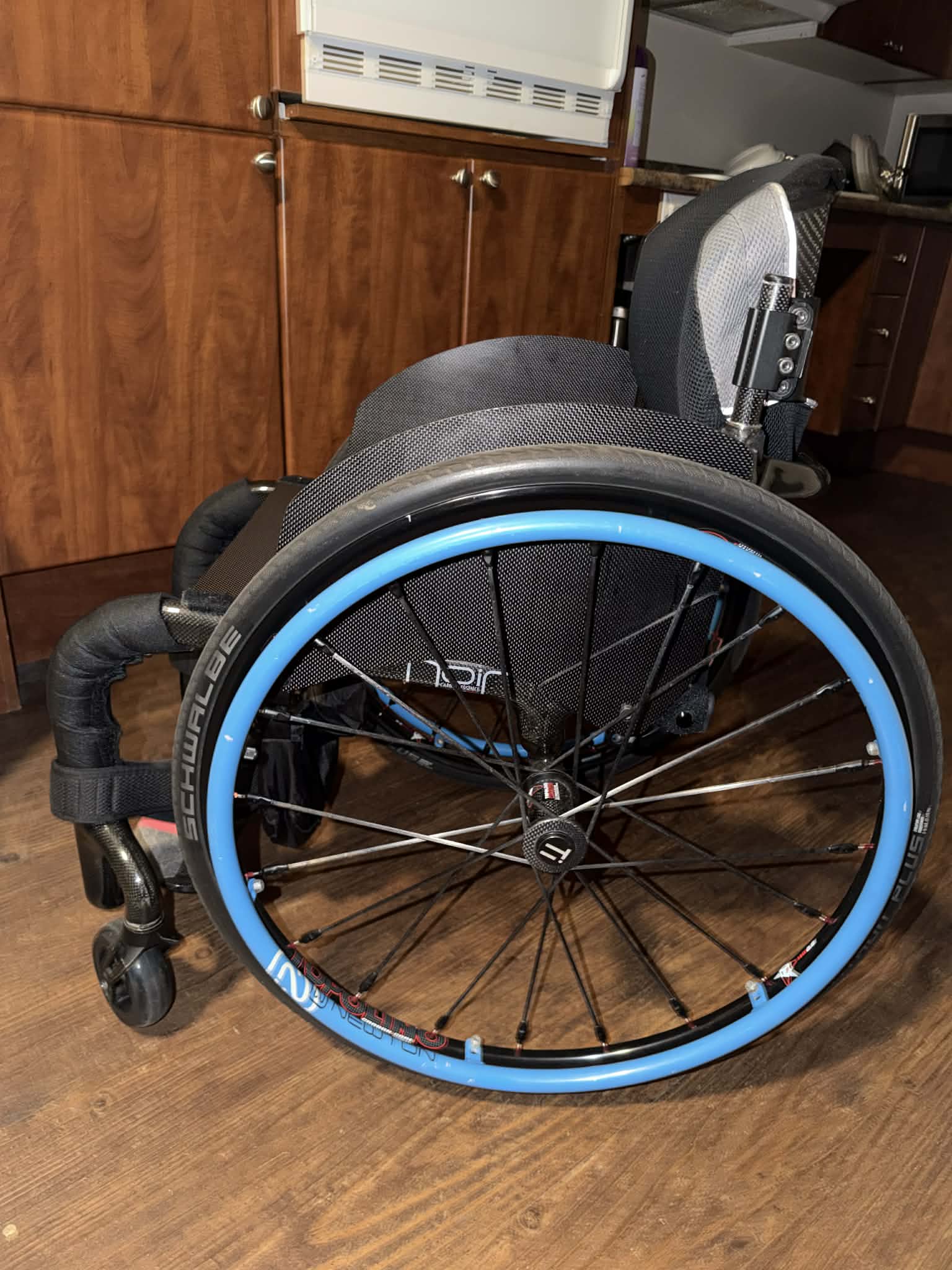 Up for grabs is my Progeo Noir 2.0 Carbon wheelchair. Well maintained and still in almost perfect condition aside from a few little scratches. The only adjustability on this chair is the backrest cane height and backrest angle. Seat width is 15.5" and the depth is 15.5". Comes with a NXT Carbon backrest & 24" Topolino Carbon Wheels.