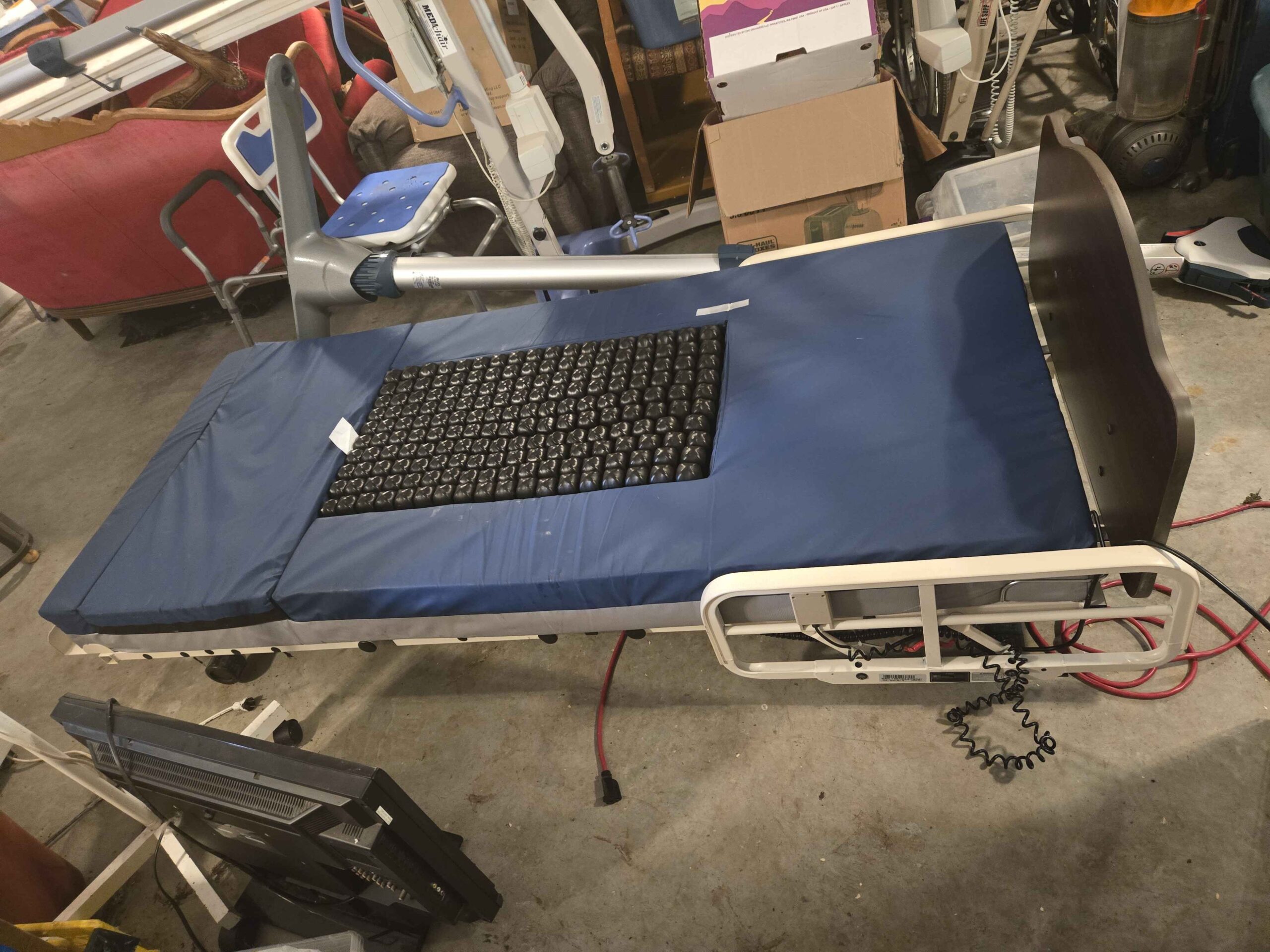 This is a specialized mattress by Permobil. It's a modular mattress system with a Roho dry floatation insert. It comes with a pump to adjust the insert. Used in association with adjustable hospital beds. New, this mattress would cost $3000.